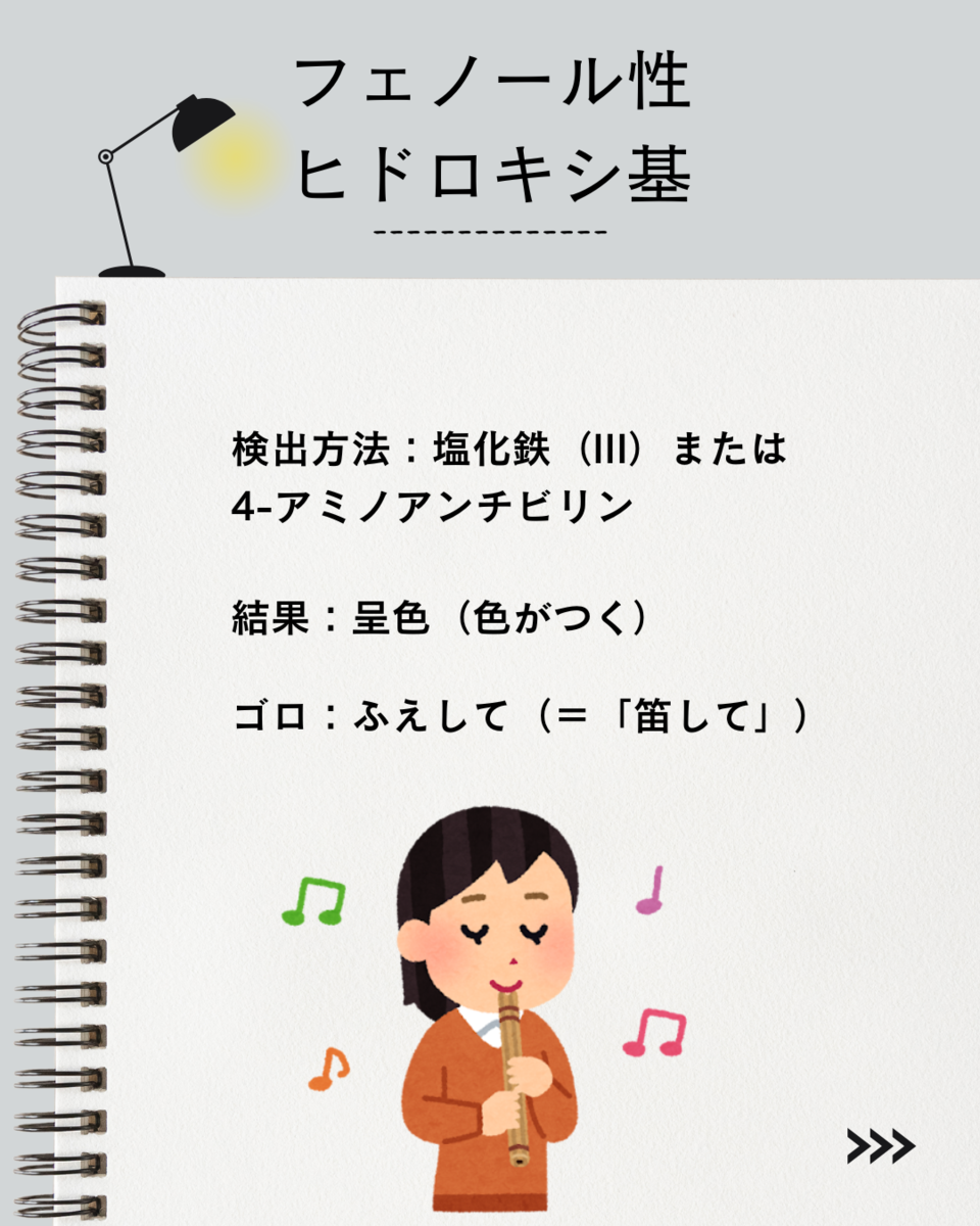 ちょっと覚えにくくてごめんなさい…!でも、「笛(=ふえ)」でフェノールと塩化鉄、「して」で4-アミノアンチピリン、と笛を吹くと色が付くイメージで覚えましょう。
