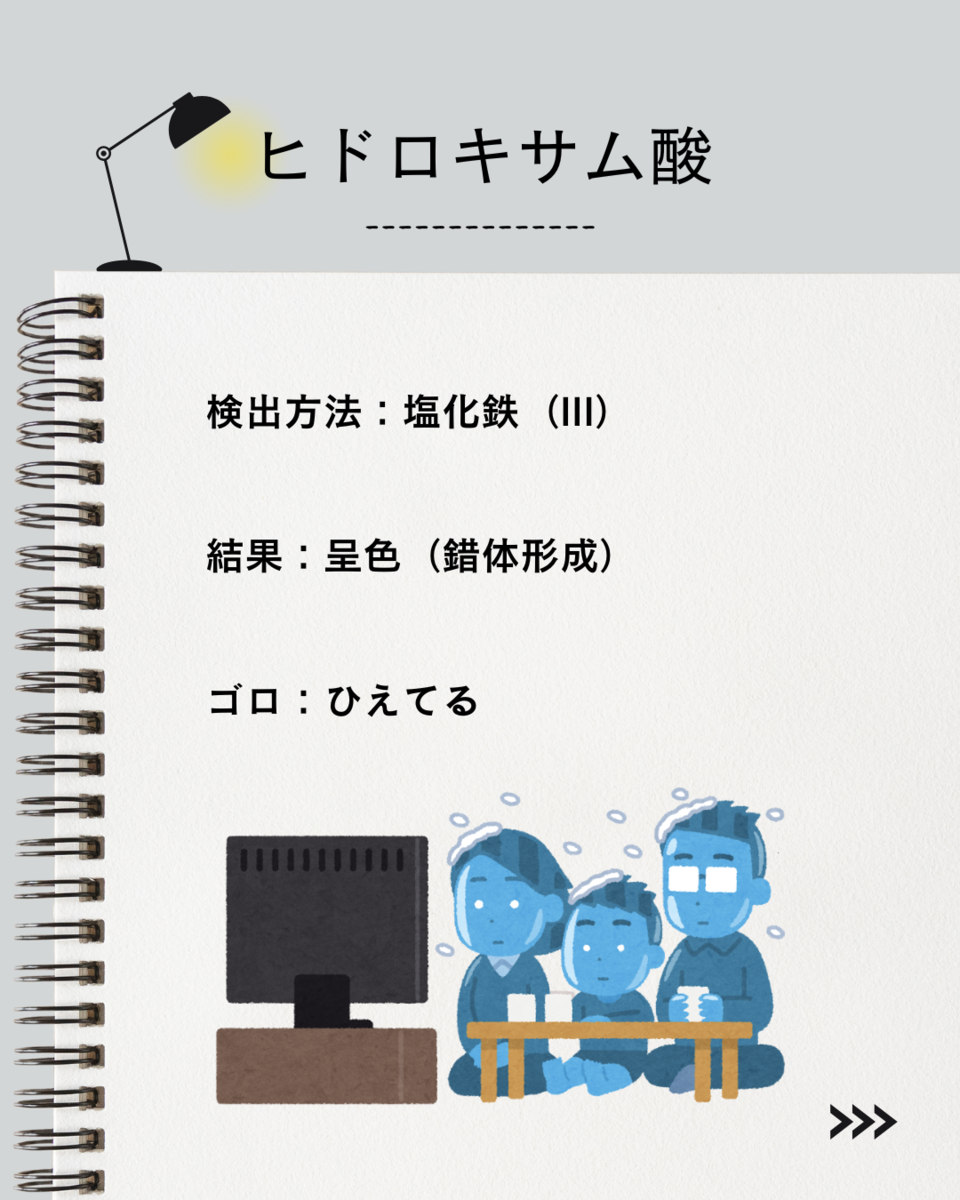 ヒドロキサム酸と塩化鉄で「ひえ」、呈色で「てる」、冷えて錯体になるイメージで!