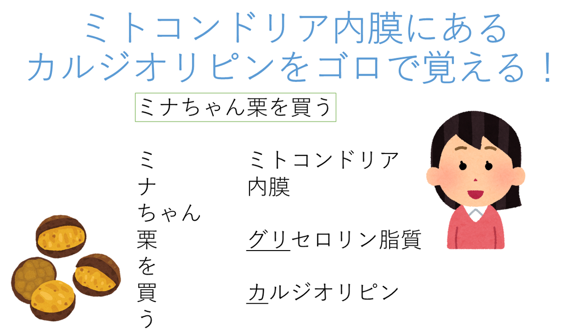 カルジオリピン:ミトコンドリアで合成され,主にミトコンドリア内膜に存在するリン脂質。他のリン脂質とは異なり二量体の構造を持ち,ミトコンドリアのエネルギー生産に必須の役割を持つ。