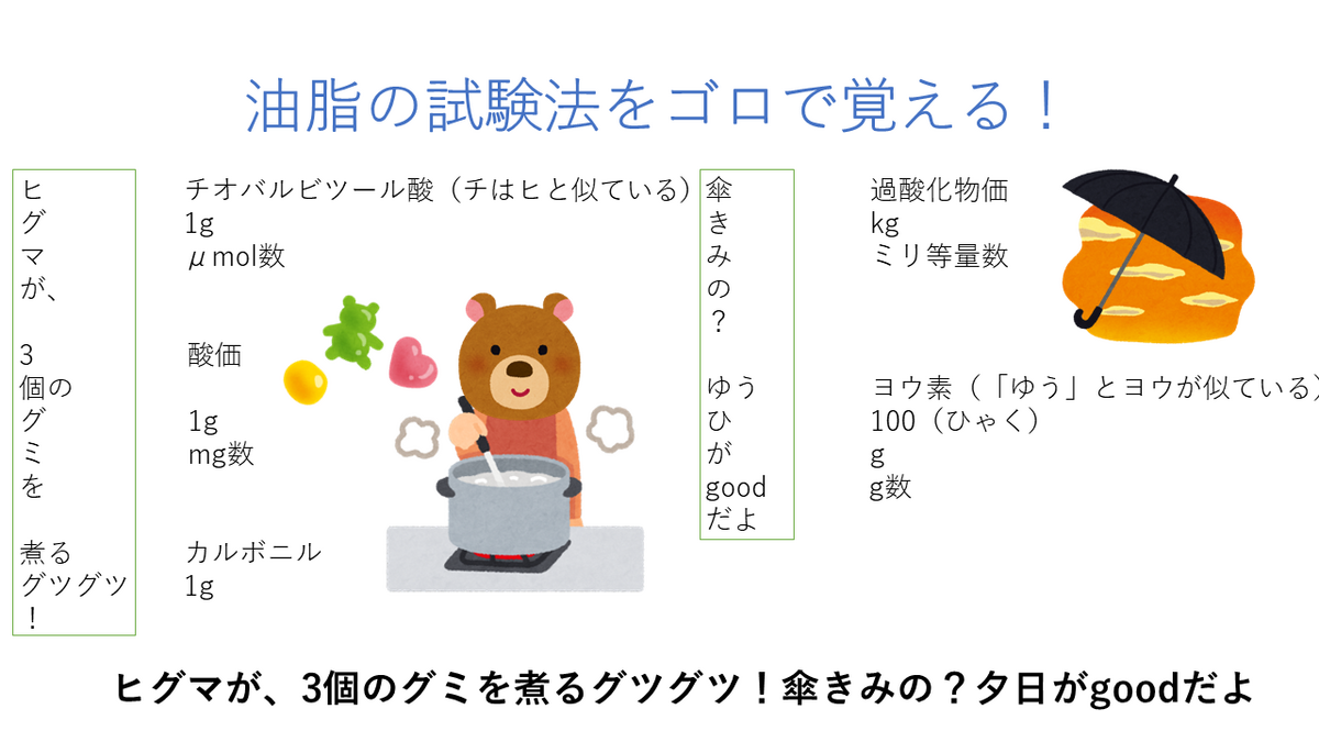 数字と単位を絡めたゴロ合わせで「どの試験に何 g(kg)を使い、何を測るか」を瞬時に思い出せるようになる
