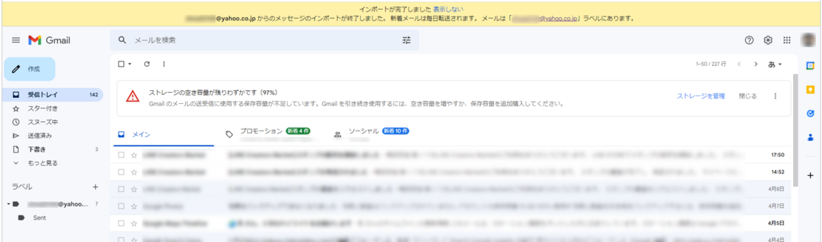 - 半日経つと、上側に「インポートが完了しました。新着メールは毎日転送されます。」と表示されます。